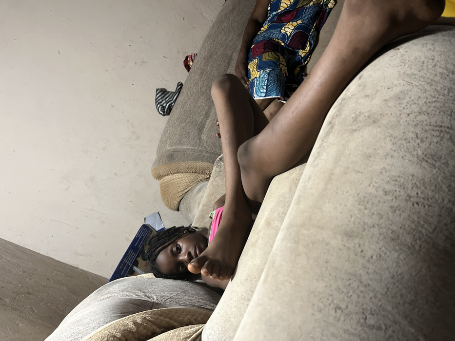 A girl with braids lies on a beige couch, wearing a pink tank top. Another person's legs are positioned in front of her, one foot resting near her face. A person in a patterned dress stands nearby. A box sits on the couch near the girl's head. The scene is indoors.