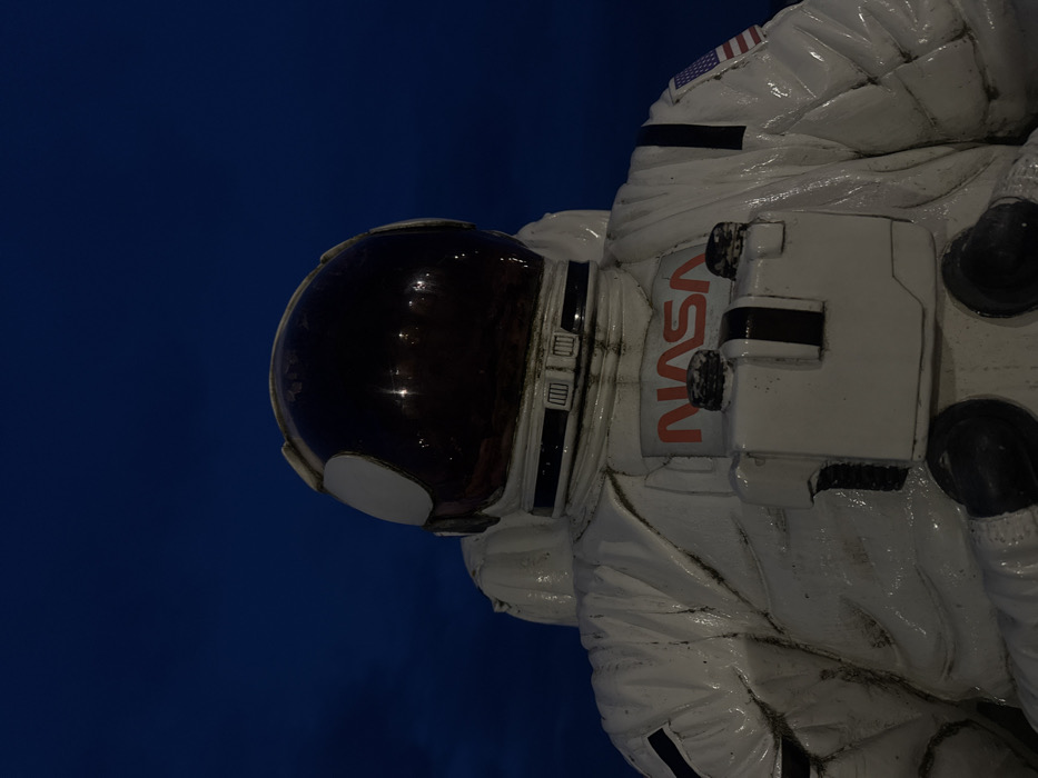 An outdoor sculpture depicting the upper torso of an astronaut in a white Extravehicular Mobility Unit (EMU) is shown against a dark blue sky, indicative of dusk or night