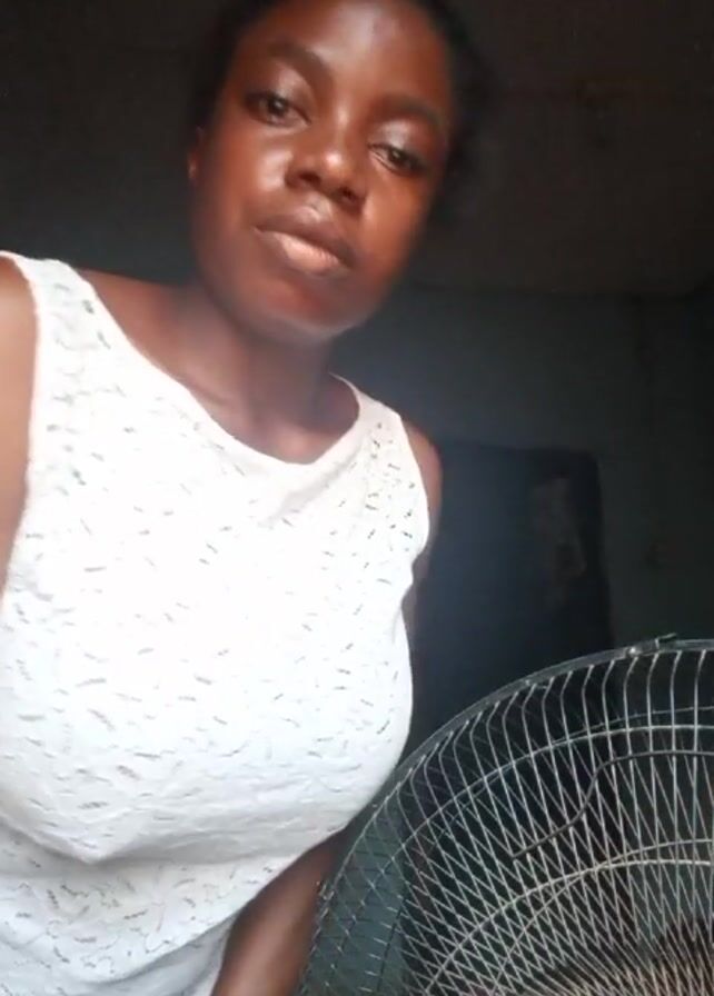 A woman stands indoors in front of an electric fan. She wears a white sleeveless lace top. She is facing forward, looking down slightly at the camera. She puts her hands on her face briefly. The background is dark.