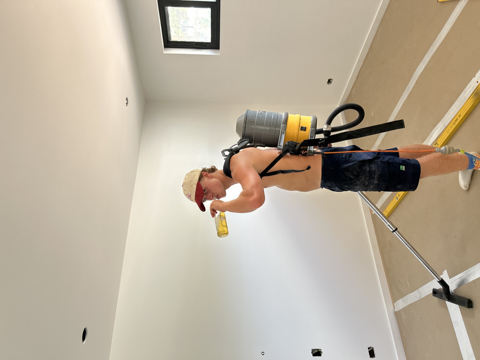A shirtless man wearing a baseball cap and a backpack vacuum cleaner drinks from a beer bottle. He stands in a room with white walls and a light brown floor marked with white lines. A window is in the upper part of the frame. A long tool with a flat head rests on the floor, and a level is visible on the right. The image has been rotated 90 degrees counter-clockwise.
