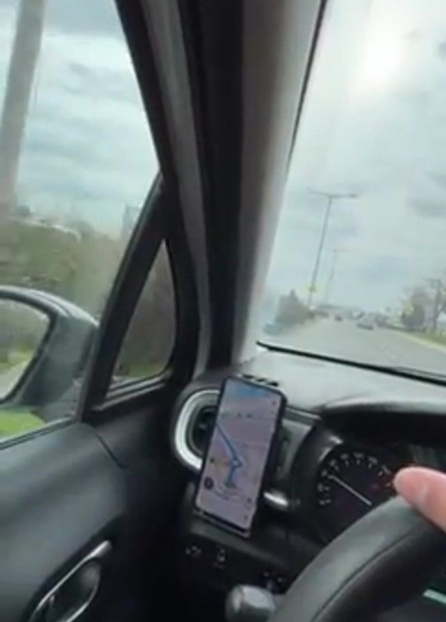 driver's perspective while navigating a car on a highway. The driver's hand is visible on the steering wheel. A smartphone mounted on the dashboard is displaying a map. The view through the windshield shows other vehicles on the road, overhead road signs, and buildings in the distance under a cloudy sky.