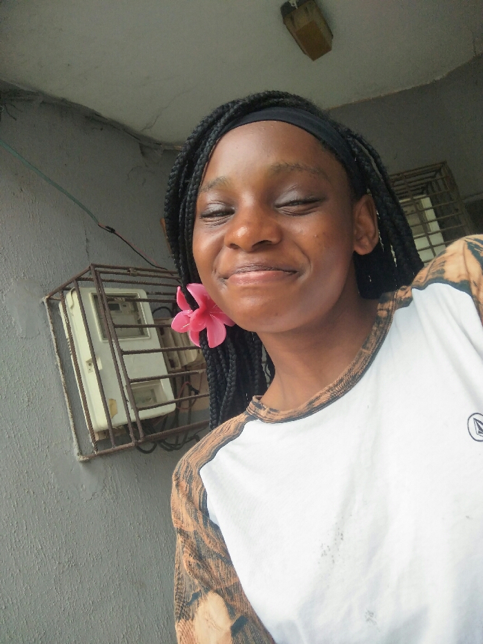 A young female, appearing to be in the city of Iranla, Nigeria, is depicted in a medium-shot selfie with closed eyes and a slight smile. She possesses dark skin and black braided hair, secured with a black headband. A vibrant pink flower is tucked behind her left ear. She wears a white long-sleeved shirt with brown and black patterned sleeves. Her head is tilted slightly to the right. The background features a grey concrete wall to the left, with an electrical meter or similar utility box enclosed within a rusted metal cage affixed to it. Above, a concrete ceiling is visible, featuring a discolored, rectangular light fixture attached near the upper right corner. The lighting suggests an overcast day or shaded outdoor area.