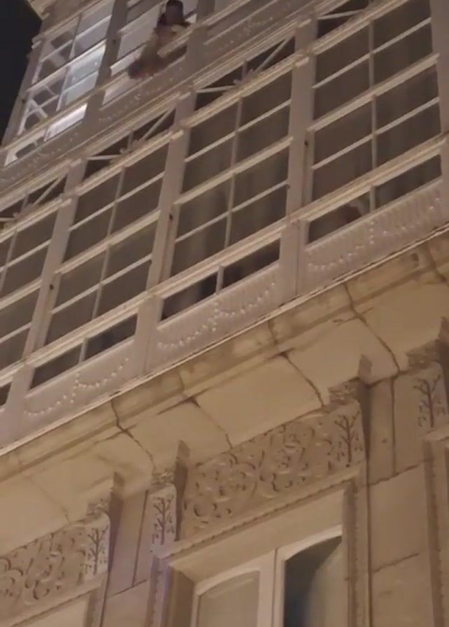building at night. A person appears on the top floor of the building and drops an item out of the window. The item falls, and the camera follows its descent, revealing that it is a colorful flag or fabric. Below, people are walking on the street. One person is dressed as Woody from Toy Story. The camera captures the flag as it lands on the sidewalk. Street signs labeled "CANA" and "CASTO" are visible. The building is decorated with ornate stonework and multiple windows.