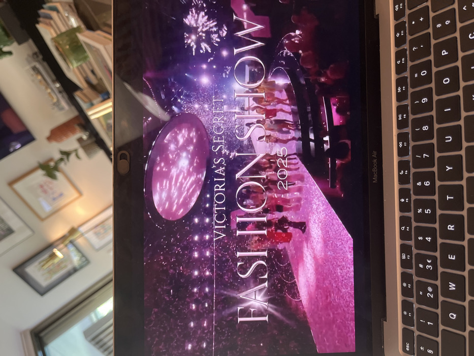 The image displays a partial view of a silver MacBook Air laptop, observed from an elevated angle, located in Lordelo do Ouro e Massarelos, Portugal. The laptop's screen occupies the upper two-thirds of the frame, showcasing a vibrant "Victoria's Secret Fashion Show 2025" event. The on-screen content features multiple individuals, presumed to be models, walking a pink-lit runway covered in scattered pink confetti. A large, circular, illuminated structure hangs above the stage, and an audience is dimly visible in the lower right portion of the screen, bathed in pink light. A brown, sliding webcam cover is affixed to the top center bezel of the laptop screen. The lower third of the image reveals the laptop's dark grey keyboard with a QWERTY layout, showing Portuguese specific characters (e.g., '€' on the '4' key). Above the laptop screen, a blurred indoor environment is visible, featuring a light-colored wall with several framed pictures, a partially obscured window on the left, and indistinct objects including a green potted plant on a surface to the right.