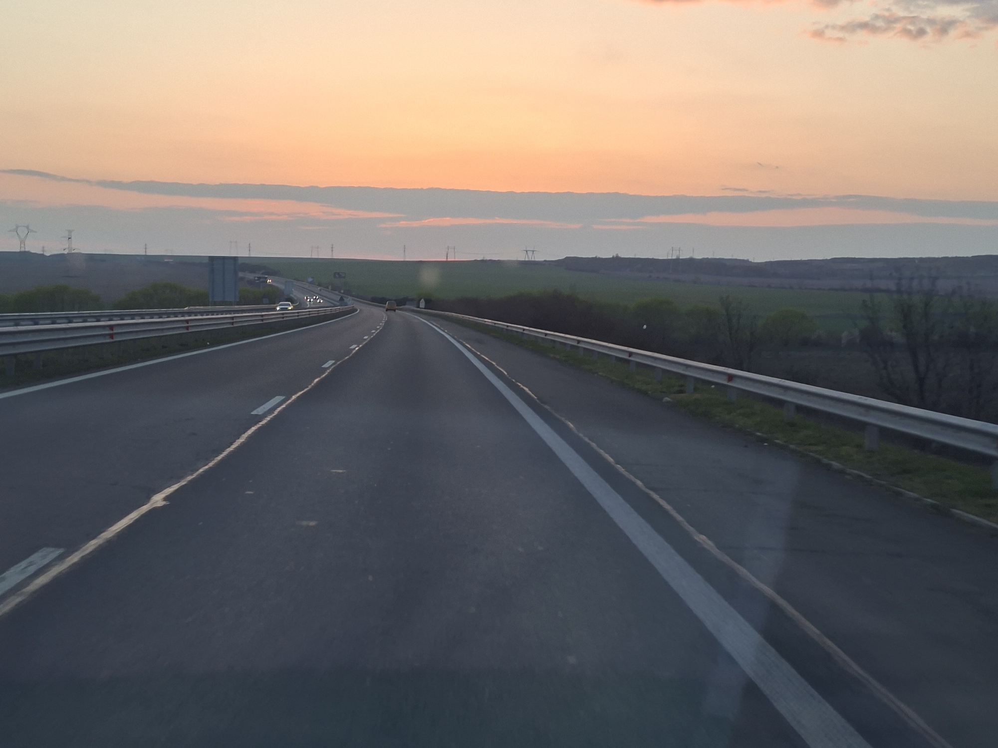 The image displays a multi-lane highway in Bulgarovo, Bulgaria, at dusk
