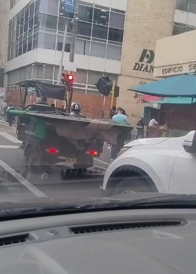 The video, shot from inside a car stopped at an intersection, shows a green, three-wheeled vehicle with a flatbed carrying what appears to be debris or waste