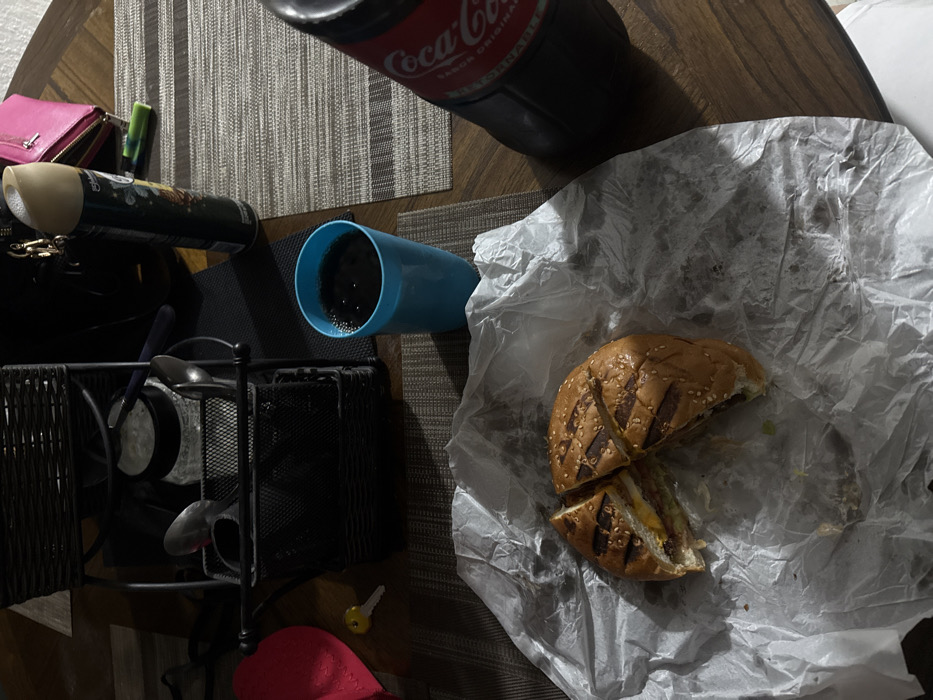 A table arrangement includes a cut hamburger wrapped in white paper, a blue cup filled with dark liquid, and a bottle of Coca-Cola