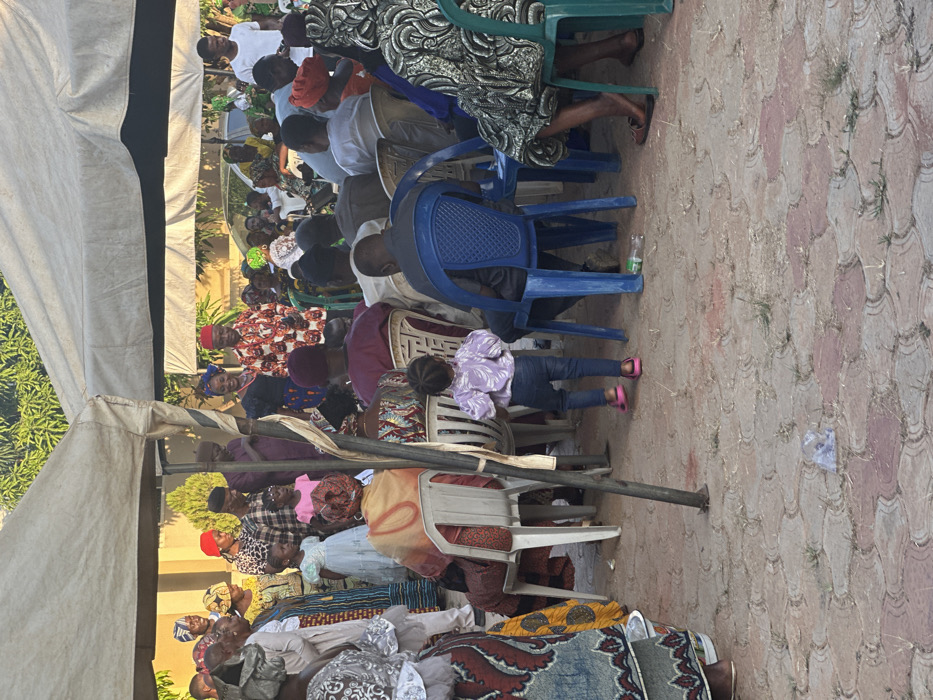 A crowd of people sits under a tent, mostly on plastic chairs. The focus is on a young girl in jeans and a lavender shirt, who is straddling her chair, facing backward. Various adults are seated, with some wearing colorful traditional clothing. A plastic bottle sits on the ground next to the chairs, and the floor is paved. The image is rotated horizontally.