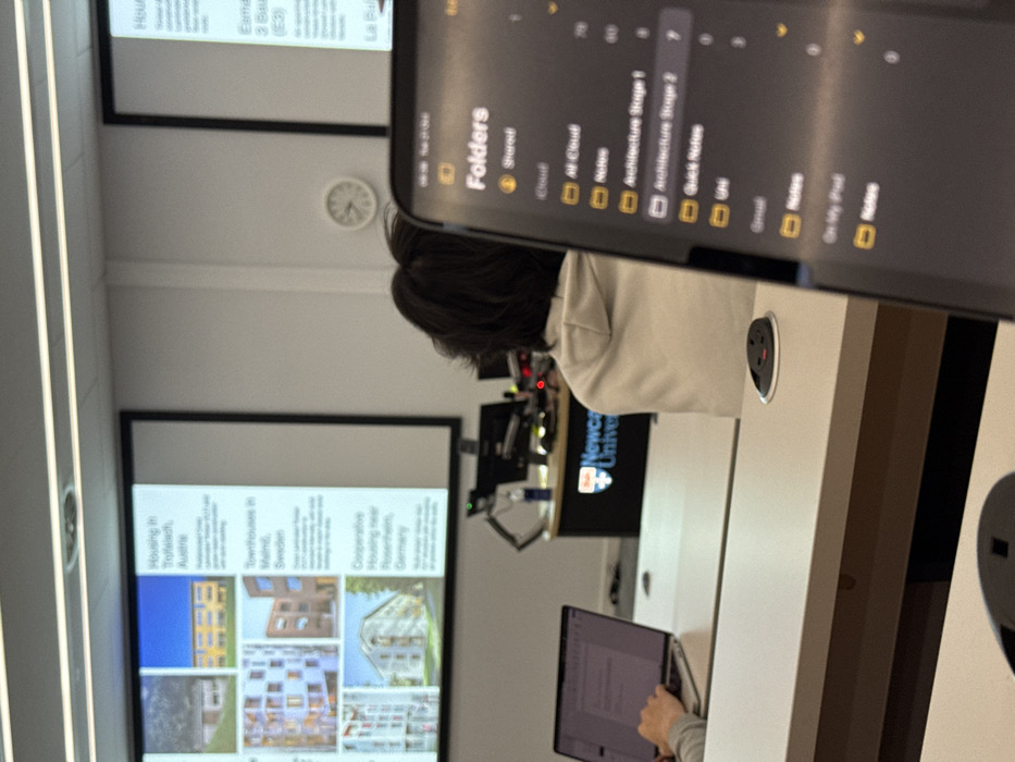 The image depicts the interior of a university lecture theatre or classroom at Newcastle University in Newcastle upon Tyne, United Kingdom. In the immediate foreground, a dark grey smartphone or tablet is held vertically, partially obscuring the view. Its screen displays a "Folders" menu, with "Architecture Stage 2" highlighted, showing "7" items. The device's status bar indicates "09:30 Tue 21 Dec." In the midground, the back of a person with dark, wavy hair, wearing a light-colored hooded sweatshirt, is visible, seated at a desk. To the left, another person's hands are seen typing on a silver laptop, which is open on a desk displaying text. The desks are light-colored and feature integrated black circular power outlets. The background reveals a lectern with the "Newcastle University" logo and text. Two large projection screens are displayed against a white wall. The left screen shows a presentation slide featuring various housing projects, including "Housing in Töfledsch, Austria," "Townhouses in Malmö, Sweden," and "Cooperative Housing near Rosenheim, Germany," accompanied by images and descriptive text. The right screen is partially visible, showing similar content. A white circular wall clock is mounted between the screens, indicating a time around 9:30-9:45. Presentation equipment, including a monitor and microphone, are visible on the lectern. The room is illuminated by overhead fluorescent lighting.