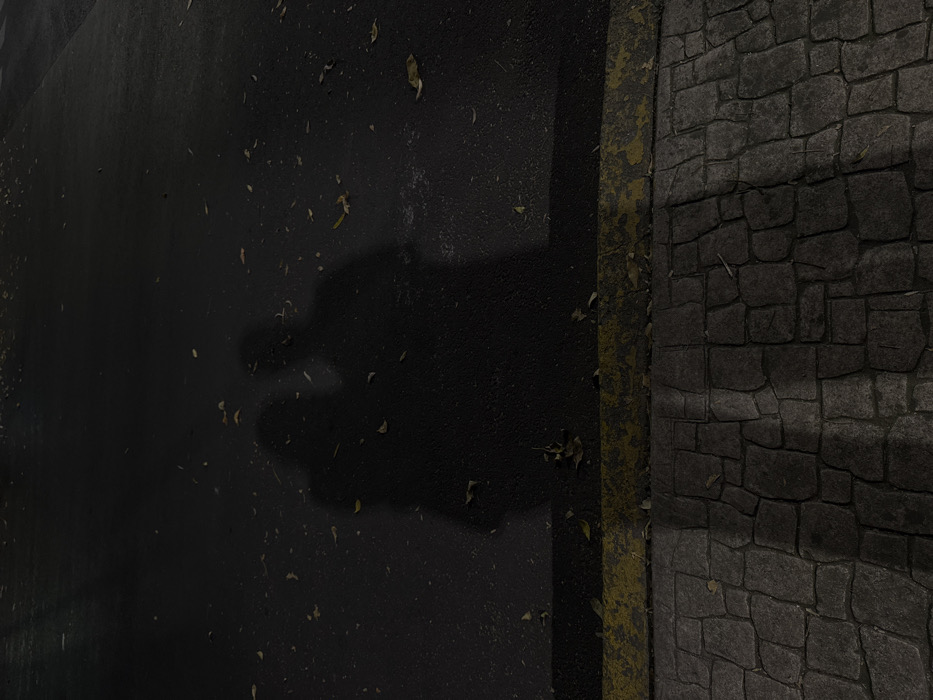 This image displays a low-light, street-level scene, characteristic of urban environments in Mexico City, Mexico. Two distinct human shadows are prominently cast onto a dark asphalt surface, which is sparsely covered with dry, fallen leaves. The shadows are in close proximity, suggesting two individuals standing near each other, with their profiles oriented towards the center of the frame. A worn yellow painted curb horizontally delineates the asphalt from a dark gray, patterned cobblestone or stamped concrete sidewalk that occupies the lower portion of the frame. The scene is illuminated by an unseen light source positioned behind the subjects, indicating nighttime or deep shadow conditions.