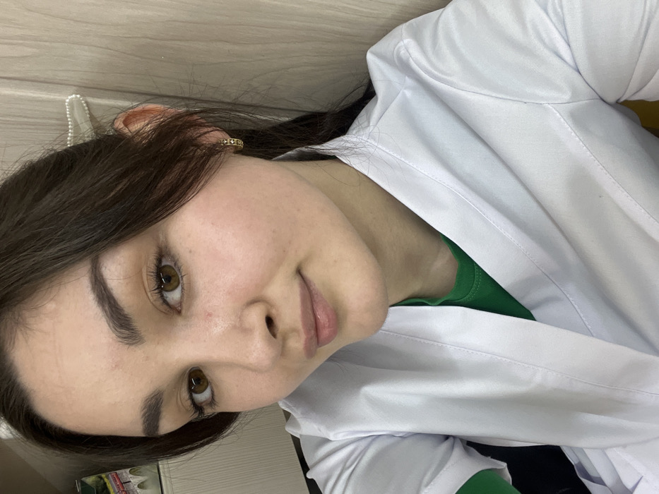 A head-and-shoulders portrait depicts a young female looking directly into the camera with a neutral expression and slightly parted lips. She has dark brown hair, hazel eyes, and groomed eyebrows. She is wearing a white V-neck garment, consistent with medical or professional attire, layered over a vibrant green t-shirt. A golden hoop earring with small square embellishments is visible in her right ear. A white hair clip adorned with pearls is fastened in her hair on the right side of her head. The background consists of light-colored wood paneling on the right and a plain lighter wall on the left. A green-labeled product box with a graphic and Cyrillic text is partially visible in the upper left background. The scene is an indoor environment. No specific location within the city of Neftekamsk, Russia, can be ascertained from the visual evidence presented.