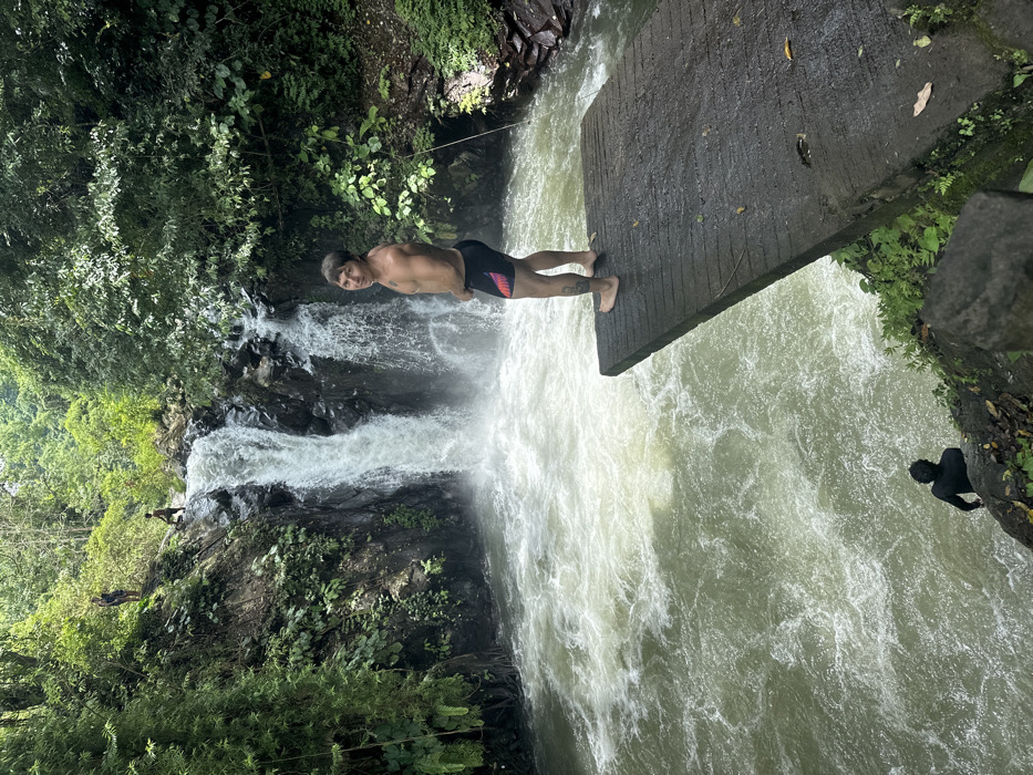The image depicts a natural waterfall scene in Ambengan, Indonesia, characterized by dense, lush green tropical foliage. In the foreground, a shirtless male with dark hair, wearing black swim trunks with red and white accents, stands barefoot on a grey concrete diving platform that extends over a turbulent body of water. He is positioned with his back partially to the camera, looking over his right shoulder towards the viewer. A prominent waterfall cascades from a rocky cliff face in the midground, creating a foamy, light-green pool of water below. To the lower left, another individual in a dark long-sleeved shirt is partially visible, standing on a dark rock at the water's edge. In the upper left background, two additional individuals are observable on the rocky terrain above the waterfall. The environment is rich with varied vegetation, including large trees, smaller plants, and bamboo stalks.