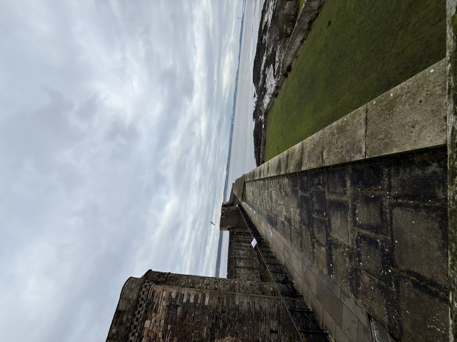 The image depicts an elevated view from Blackness Castle, Blackness, United Kingdom, overlooking the Firth of Forth on an overcast day. In the immediate foreground to the left, a weathered stone pathway composed of large, dark pavers extends diagonally into the distance. This pathway is bordered on the left by a black metal railing and a massive, multi-tiered stone wall section, including a prominent circular tower constructed from irregular brown and grey stones. Two white informational placards are affixed to a lower section of the wall beyond the railing. A small blue flag is visible atop a more distant stone wall. To the right of the pathway, a rough stone parapet borders a sloped, vibrant green grassy area that descends towards the water. Below the grass, a wide, rocky, and muddy foreshore is exposed. The midground features a expansive body of choppy water, the Firth of Forth, under a uniformly grey, cloudy sky. In the far background, distant landmasses and faint grey structures, including what appears to be a suspension bridge on the far right, are visible on the horizon. No individuals, animals, or vehicles are present.