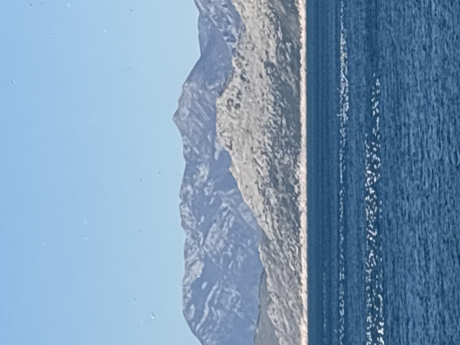 The image displays a panoramic natural landscape in the area of Kunje, Montenegro. The upper third of the frame shows a clear, light blue sky with multiple scattered small, bright, out-of-focus specks. The midground consists of a layered mountain range; a closer, lower band of rugged, light grey, rocky hills with textured surfaces rises directly above a body of dark blue water. Behind these foreground hills, a more distant, taller range of blue-grey mountains is visible, featuring discernible peaks and geological striations. The lower third of the image is occupied by dark blue water, which exhibits a rippled surface and two prominent horizontal bands of small white surface disturbances. No individuals, artificial structures, or active events are present within the depicted scene.