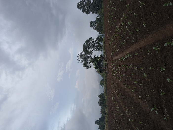 A cultivated field of young plants stretches under an overcast sky. Rows of vegetation are neatly planted in dark soil, leading towards a wooden structure nestled among trees. The sky is filled with gray clouds, hinting at possible rain. Taller trees border the edge of the field, contrasting with the open sky and the low-lying crops.