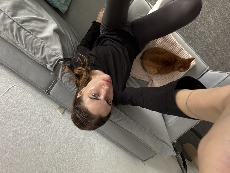 A woman lies on a gray couch, head near the lower left corner, facing the camera. She wears dark leggings and a long-sleeved black shirt. An orange cat sleeps on a pale pink knitted blanket near her legs. The couch is modular, with gray cushions. The background includes a white wall and a gray carpeted floor. The woman's arm is extended towards the viewer, with a thin circular tattoo visible on her inner forearm.