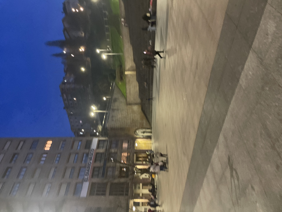 A slightly blurred, angled photograph of a city at dusk. In the foreground, a wide, paved square with people scattered around tables. To the left, a tall building with lighted windows and a banner reading "EL DIARIO VASCO." Beyond the square, an old stone structure, perhaps a fortress or historical building, is illuminated by streetlights. Above it, more buildings are visible against the dark blue sky.