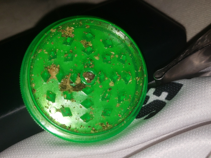 The scene, located in Asaba, Nigeria, presents an overhead close-up of a translucent green circular herb grinder top, approximately 10-12 cm in diameter. Its internal chamber contains numerous fragments of dried, greenish-brown plant material, varying from finely ground particles to larger pieces, distributed among square-shaped grinding teeth. The grinder rests partially on a white, textured fabric with a partial black and white logo. To its immediate right, a silver-colored metallic object, resembling tweezers or a roach clip, is partially visible. The background is dark and indistinct. No individuals are present.