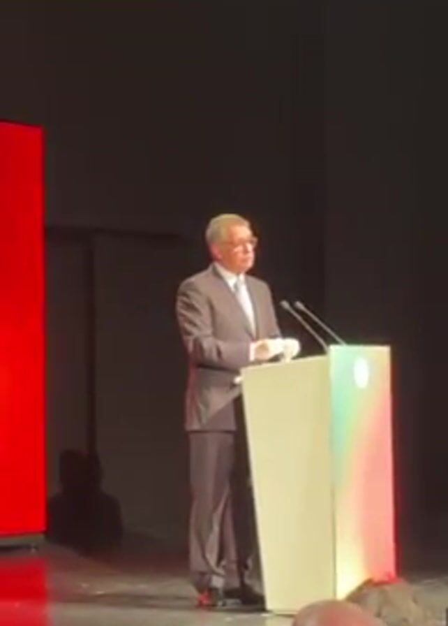 A man in a suit is standing behind a podium on a stage, speaking into two microphones. He is holding a small piece of paper in his left hand and gesturing with his right hand. The podium is white with a colorful design on the front. Behind him is a red panel on the left and a black backdrop. In the foreground, there are some audience members visible, including an elderly man with a white beard. The stage floor appears to be dark wood.