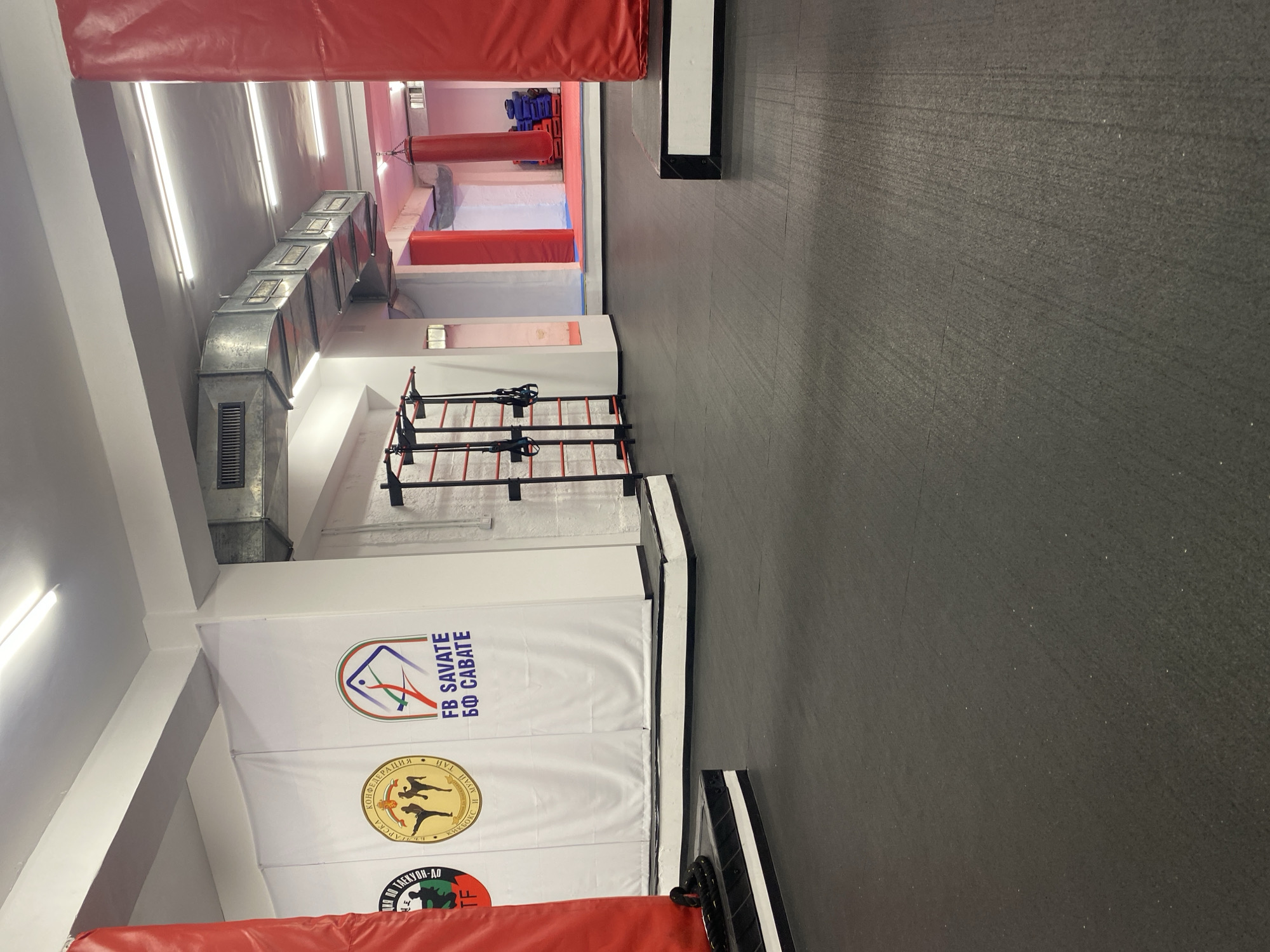 interior of a martial arts training facility, specifically in Asenovgrad, Bulgaria. The room features a gray, textured floor, possibly made of interlocking mats. Along the left wall, there are white panels or banners displaying logos of martial arts organizations, including "FB SAVATE БФ САВАТЕ" and another one with the text "ИНЯ ПО ТАЕКУОН-ДО". Above these panels, there's an industrial-looking air conditioning duct. In the background, there is a padded area with red and blue mats, potentially for sparring or other training activities. A wall ladder with black bars and red rungs is present, along with suspension training straps. A red pad is placed at the bottom of the image, and another one on the upper side, possibly marking the training area. The lighting is provided by fluorescent tubes mounted on the ceiling.