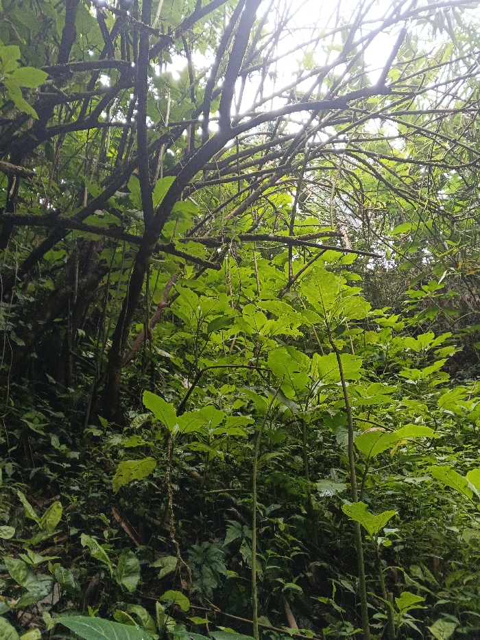 The image depicts a dense, verdant forest environment located in Bagochen Boolingpang Ueling, Bhutan. The scene is characterized by abundant vegetation, primarily consisting of trees and undergrowth, viewed from a low angle looking upwards. The upper third of the frame shows a network of dark, bare branches and twigs, some appearing to be covered in moss or lichen, silhouetted against a bright, overcast sky that diffuses light through the canopy. The mid-ground features numerous large, broad, vibrant green leaves on various plants and young trees, illuminated brightly. The lower two-thirds of the image are filled with dense, multi-layered foliage in various shades of green, including smaller leaves, ferns, and ground cover, with shadows indicating depth and density. No people, animals, or artificial structures are visible. The environment suggests a humid, natural forest setting with ample light reaching the mid-level canopy. There are no discernible actions or interactions between subjects; the scene is static, capturing the natural state of the plant life.