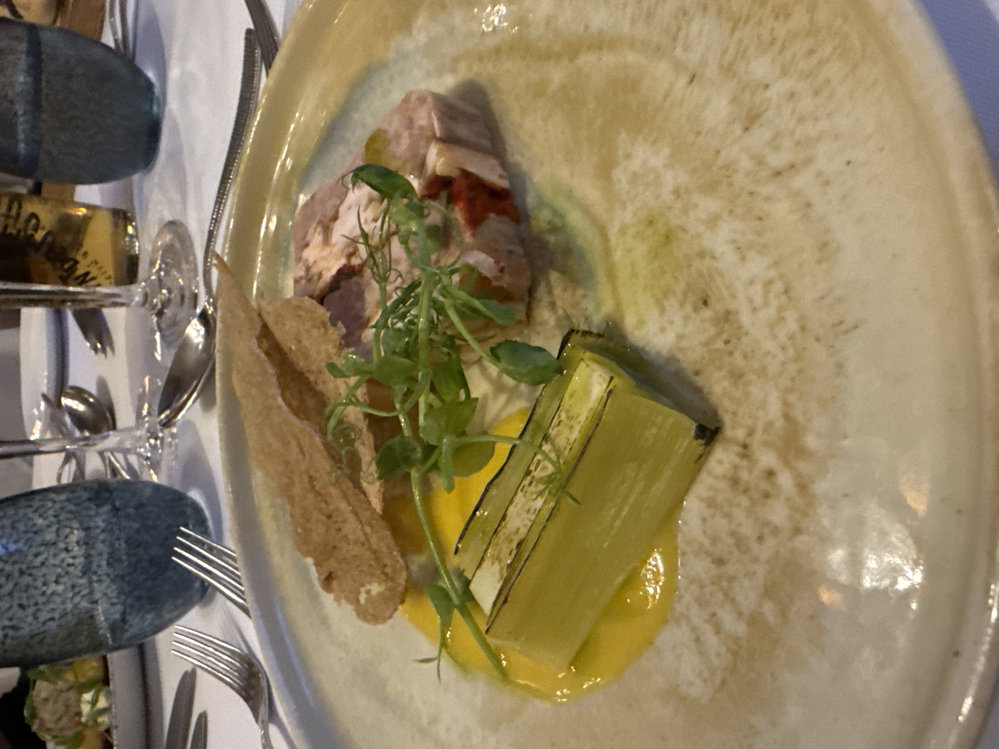 plate of food on a table setting. The plate contains sliced meat, a charred leek, fried bread, yellow sauce, and a green garnish. Cutlery and glassware are visible on the table. The location is not specified in the image, so it cannot be confirmed to be in Glenridding, United Kingdom.