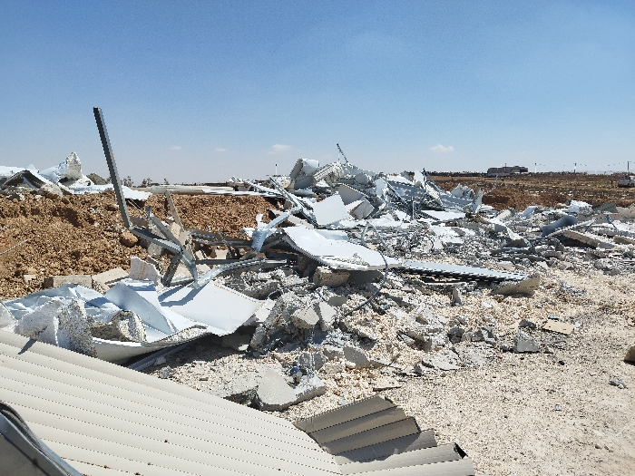 The image depicts a vast debris field resulting from structural demolition, located in Somara, Palestinian Territory, under a clear, light blue sky