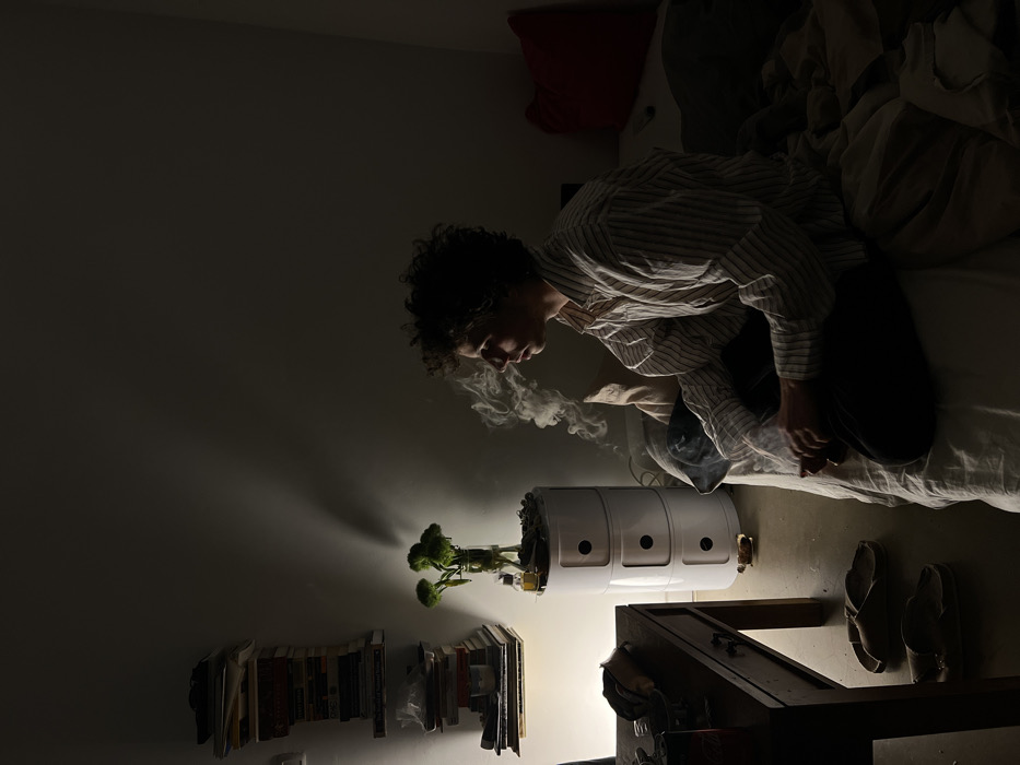 A person with curly hair sits on a bed wearing a striped shirt and dark pants, exhaling smoke. Next to the bed is a white storage unit on which sits a vase with broccoli. A stack of books rests on a shelf behind the unit. A wooden table with a dark object on it and a pair of slippers are visible next to the bed. The room is dimly lit, creating shadows around the objects.