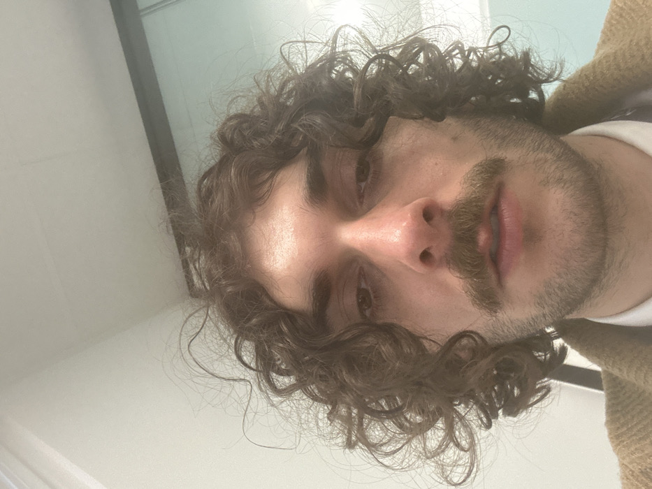 The image displays a close-up, low-angle selfie of a young adult male. He has fair skin, dark brown curly hair, a prominent mustache, and stubble on his chin and jawline. His gaze is directed downwards, not meeting the camera directly. He is wearing a white collared shirt visible beneath a tan or light brown textured overcoat. The background consists of a plain white wall on the left and a reflective surface, consistent with a window or glass partition, on the right, indicating an indoor environment. The lighting is diffused and even. The scene is located in an unspecified indoor environment within the city of Vincennes, France.