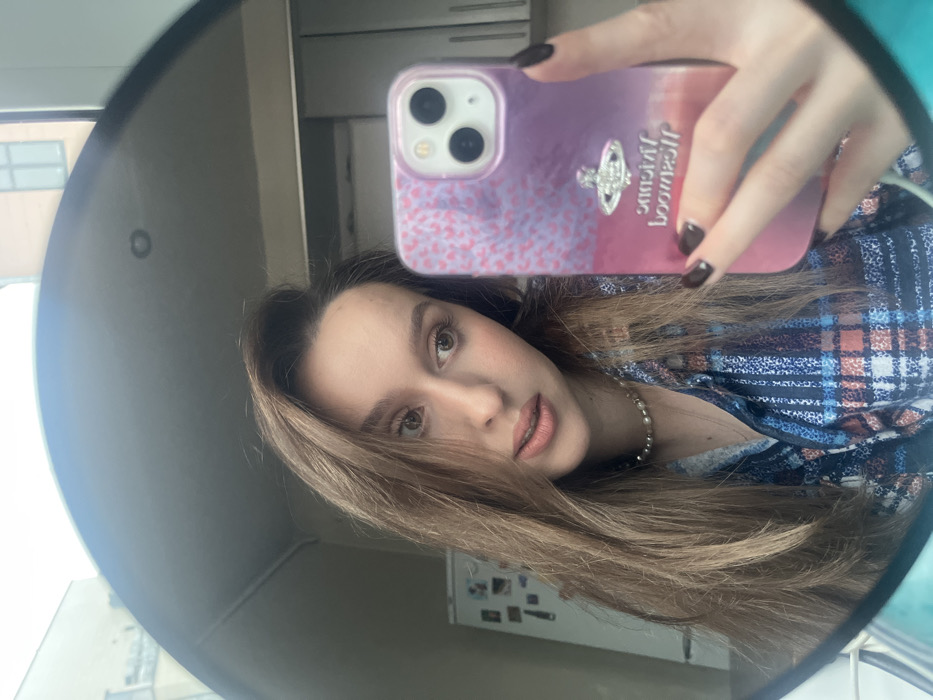 A young adult female is depicted in a circular mirror selfie, reflecting her upper body