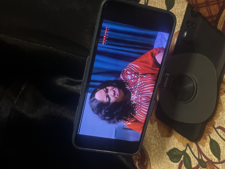 A black smartphone displays a woman on its screen, wearing an orange and white patterned dress. The text "UCHE NANCY UPDATE" is partially visible at the top. The phone has a black case. Next to it, another black smartphone is positioned, featuring a circular gray pop socket adhered to its back. The background consists of a textured brown and beige patterned surface on one side, and a dark black material on the other.
