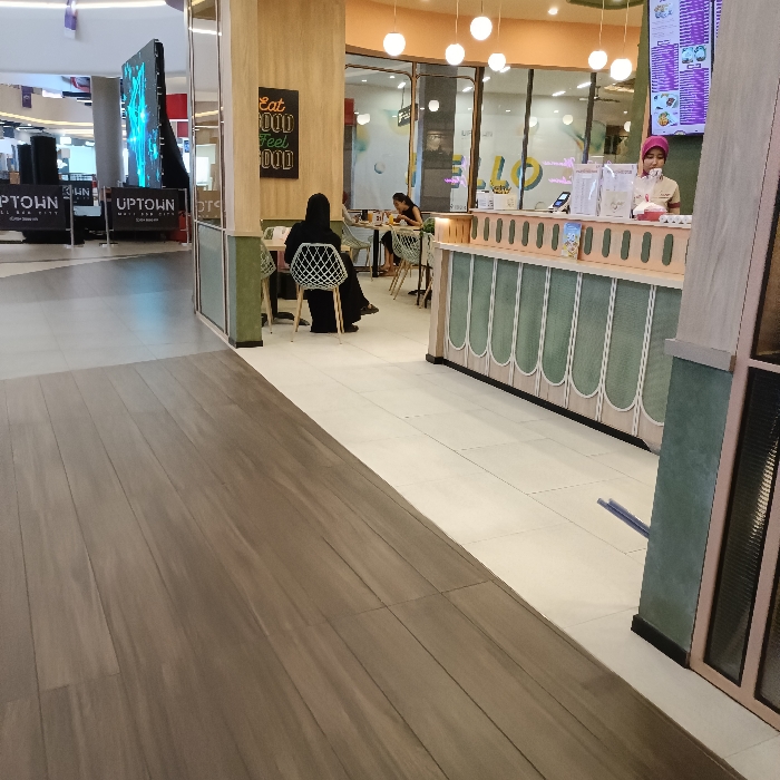 The scene takes place inside a shopping mall in Kecamatan Mijen, Indonesia, located at the coordinates -7