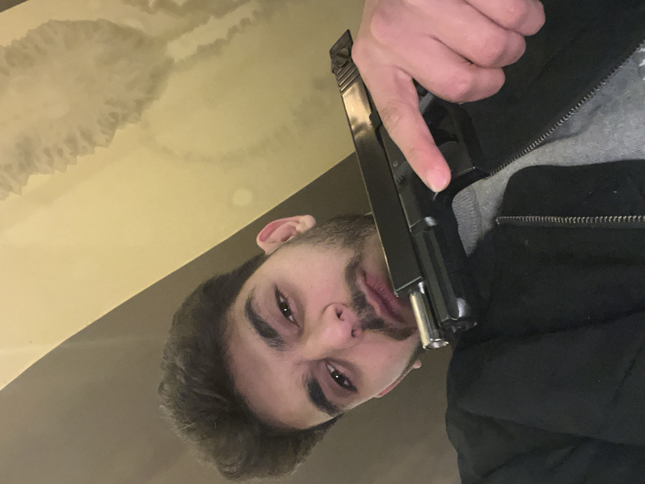 - "A low-angle, rotated shot captures a bearded man with brown hair and eyes, holding a black handgun next to his face" by FM-WnN6r1, licensed under CC BY 4.0