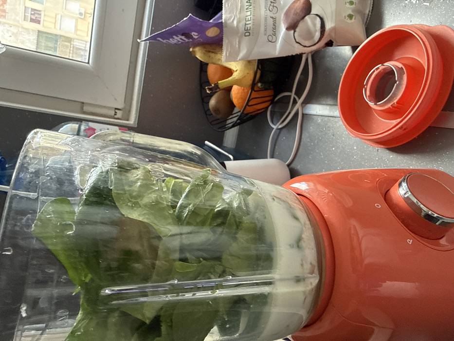 The scene is a detailed close-up of a kitchen counter in Dobrich, Bulgaria. In the foreground and left, an orange blender with a silver control knob is active. Its transparent jar contains green spinach leaves layered above a white liquid and granular contents. The blender's orange lid, including its clear central cap, rests unattached on the grey countertop to the right. A coiled white electrical cable is visible on the counter. Further right, a black wire basket holds various fruits: two bananas, two oranges, and two kiwis. Directly in front of the fruit basket, a white pouch labeled "DETELINA" in Cyrillic and "Coconut Flakes" in English is displayed. A partial purple package is behind the fruit basket. In the background, through a white-framed window, apartment buildings with multiple stories, windows, and balconies are visible, consistent with residential architecture in Dobrich, Bulgaria. No individuals are present in the image. The arrangement suggests preparation for food or drink blending.