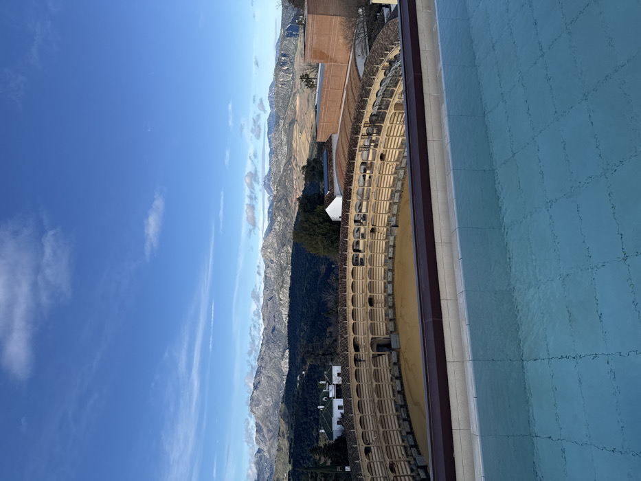 The image displays an elevated view overlooking the Plaza de Toros de Ronda, Spain. In the foreground, a light blue swimming pool with visible grid-patterned tiles extends across the bottom portion of the frame, showing minor ripples on its surface. Beyond the pool's edge, a dark brown railing with a beige base is present. The midground features the historic, circular bullring with a sandy, light brown arena floor. The surrounding barriers are constructed from light-colored wood, arranged in multiple tiers with arched openings at ground level. No individuals or animals are visible within the bullring. In the background, a vast landscape unfolds under a clear, bright blue sky with scattered white clouds. A range of snow-dusted, rugged mountains dominates the horizon. Below the mountains, dark green forested hills and lighter brown, cultivated valleys are visible. Several white-walled buildings with terracotta roofs are dispersed throughout the scene, including structures immediately adjacent to the bullring on both the left and right sides. The overall scene depicts a sunny day with distinct shadows suggesting midday lighting.