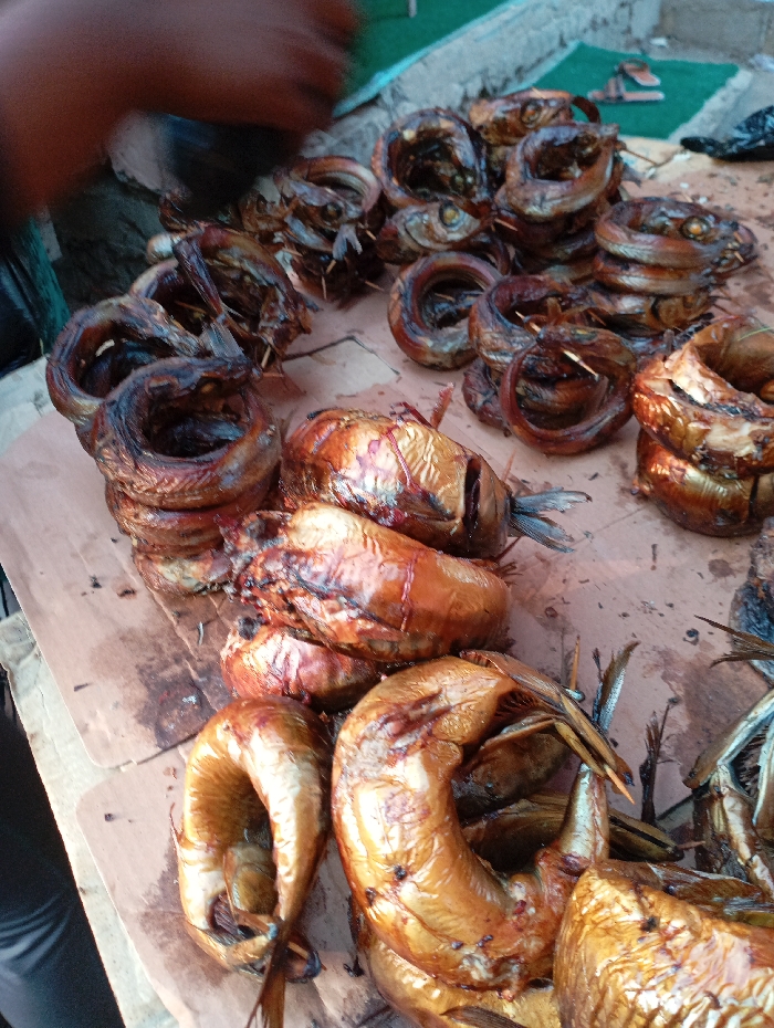 A close-up presents multiple piles of smoked fish on a surface. The fish are arranged in distinct ring-like shapes, showcasing varying shades of brown and golden hues. Smaller, darker smoked fish stacks contrast with larger, lighter-colored ones. Visible details include fish tails and hints of flesh texture, suggesting a diverse range of smoking processes. The scene implies a marketplace or food preparation setting.