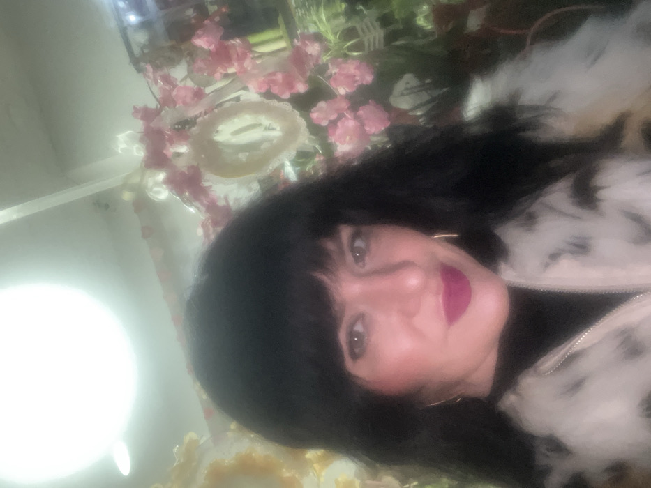 A woman with dark hair and bangs, wearing a white and black patterned jacket, looks toward the camera. She is wearing lipstick and gold earrings. Soft pink flowers and a decorative disk are in the background. Light reflects brightly in the corner of the image.