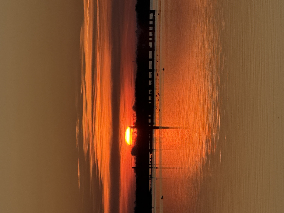 This image depicts a sunset over a body of water within Broadland, United Kingdom. The sun, a bright yellow-orange disc, is partially obscured by the distant horizon, positioned centrally near the bottom of the upper third of the frame. The sky above is dominated by stratified horizontal clouds, displaying intense shades of orange and red, transitioning to muted brownish-orange towards the top. A dark, silhouetted landmass forms the horizon line, featuring trees and indistinct structures, including a prominent cylindrical shape near the sun's position. The midground is occupied by the calm water surface, which vividly reflects the vibrant orange and red hues of the setting sun and sky. Extending horizontally across the midground, partially submerged in the water, is a line of dark, uniform posts or pylons, possibly remnants of a pier or bridge, casting vertical reflections onto the water. Several small, dark avian figures are visible scattered across the water's surface. The foreground consists of the water, showing subtle ripples and a gradient of reflected light. No individuals or specific actions are discernible.
