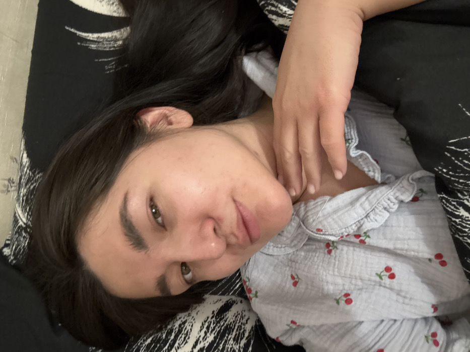 In Kurovskoye, Russia, a female subject is depicted lying down, looking directly at the camera. She has long, dark brown hair and light to medium skin tone, with visible pores and slight skin irregularities on her face. Her brown eyes are open, and her lips are slightly parted in a subtle pout or smirk. Her left hand is positioned with fingers splayed against her lower jawline and upper neck. She is wearing a light blue or grey collared shirt featuring a pattern of red cherries and ruffles along the placket. The subject is situated on black bedding; a pillow with a white abstract design is visible behind her head, and a black blanket or duvet covers the lower portion of her body.