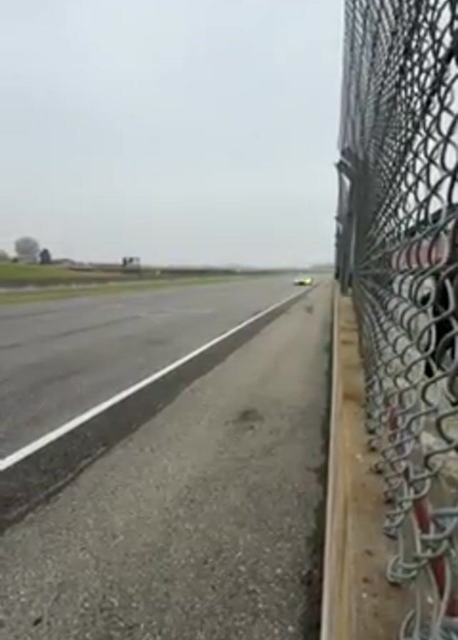 neon green sports car speeding down a racetrack on a cloudy day. The video is shot from behind a chain-link fence along the side of the track. A man wearing a black jacket can be seen briefly in the left side of the frame next to the fence.