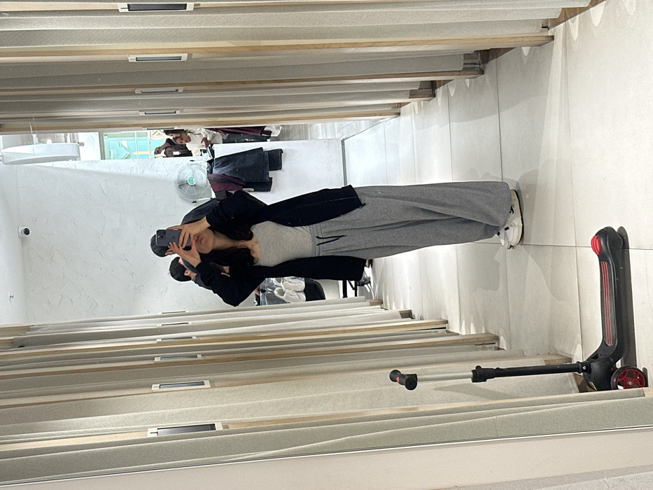 The image depicts an indoor scene within a retail environment, likely a clothing store or boutique, situated in Yerevan, Armenia. The foreground is dominated by a full-length mirror reflecting a young person, possibly female, with dark hair, standing and holding a light-colored smartphone directly in front of their face, obscuring their upper features, as if taking a selfie. This individual wears a grey tank top, grey wide-leg sweatpants with a visible drawstring, a black open-front jacket, and white sneakers. To the left, a black scooter with red wheels and highlights leans against the wall. The setting is a brightly lit hallway or aisle, characterized by light-colored, vertically paneled walls, possibly comprising changing rooms or display areas. The floor is covered in reflective light-colored tiles. In the background reflection, behind the primary subject, two additional individuals are partially visible, along with a white circular fan, a clothing rack holding dark garments, and a display of white sneakers. A security camera is mounted on the ceiling.