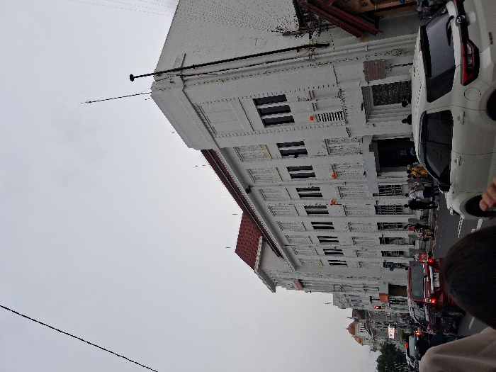 The image depicts a street scene in Yogyakarta, Indonesia, under an overcast sky. The prominent subject is a large, multi-story building on the right side of the frame, characterized by its white facade, red tiled roof, and Art Deco or Dutch Colonial Revival architectural style. This building is identified as a BNI (Bank Negara Indonesia) branch or museum, featuring numerous rectangular dark-framed windows, some with white shutters, and several ground-level entrances. A flagpole and multiple antennae are visible on its roofline. On the multi-lane road in the foreground, vehicles are either stopped or moving slowly. A white Toyota Raize SUV occupies the right foreground, facing away from the viewer. A dark red minivan (license plate DK 1219 JU) is in the mid-ground left lane. Several other vehicles, including cars and motorcycles, are visible further down the street. A red traffic light is discernable in the distance. Approximately two dozen pedestrians are visible on the sidewalk in front of the white building, congregated in groups or moving individually. In the background left, another building with a rounded, orange-domed roof and white facade is visible. A thick black utility cable diagonally traverses the upper left quadrant of the frame. The scene is consistent with Jalan Jenderal Ahmad Yani, near the Malioboro area of Yogyakarta.