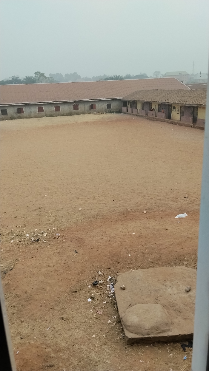 A schoolyard with a dirt field is framed by a two-story building with a corrugated metal roof and small windows