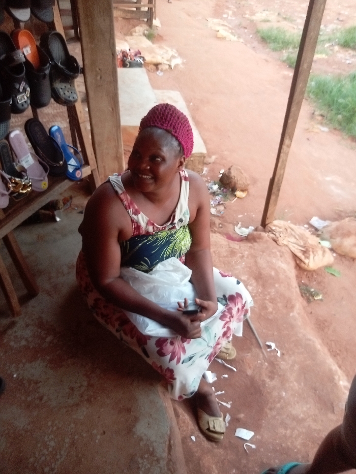 A woman sits on a concrete slab, smiling and holding a white plastic bag. She wears a floral dress, a dark pink knitted cap, and sandals. Behind her, a wooden shelf displays various types of footwear. The background includes a dusty, reddish-brown ground with debris and a wooden support structure. Her right leg is outstretched, showing off her sandal.
