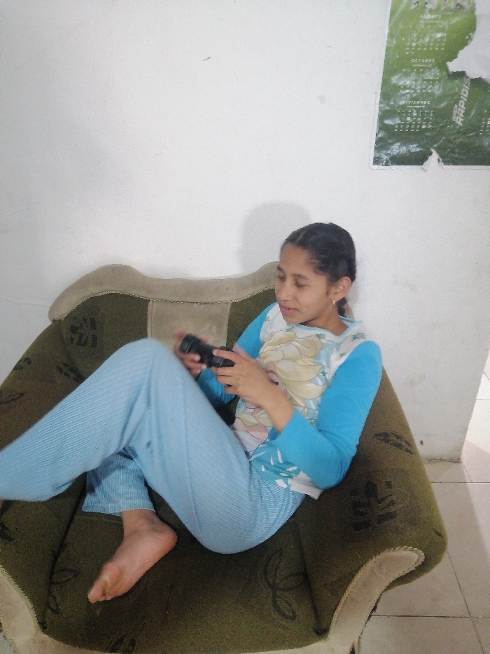 - "A young girl sits on a green armchair, wearing blue pajamas with a graphic print shirt" by FM-fnOaw2, licensed under CC BY 4.0