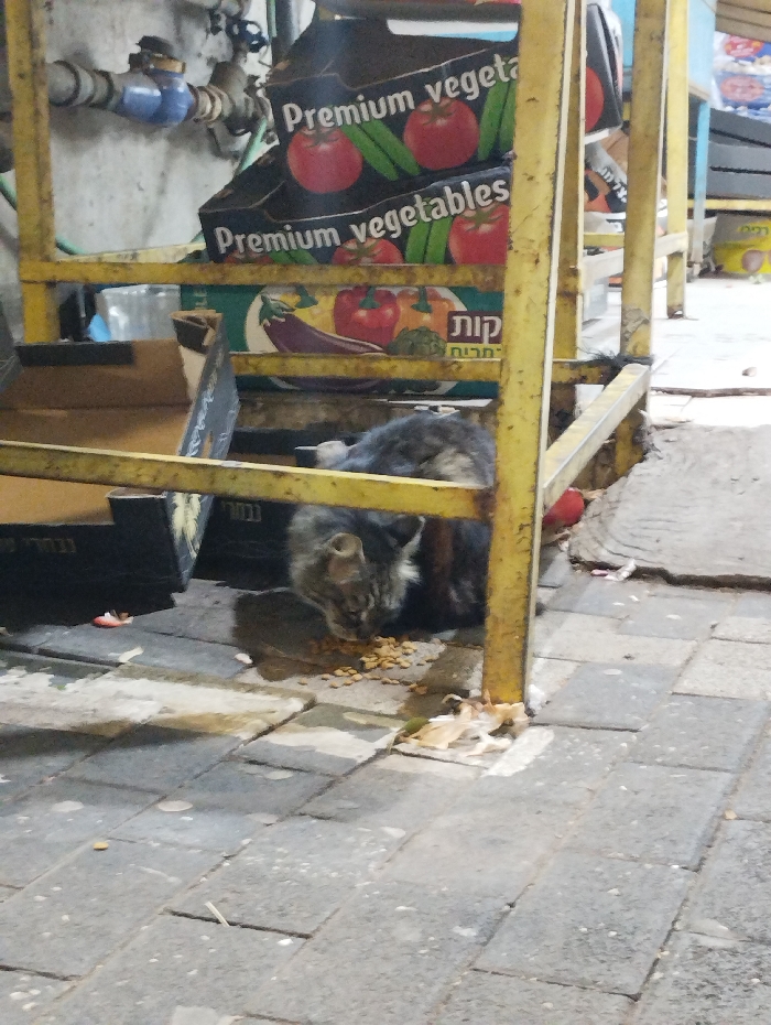 The scene is located in the city of Petah Tikva, Israel. A medium-haired domestic cat, primarily grey with brown and black tabby markings, is observed in a crouched position, consuming dry kibble scattered directly on a stained grey concrete block pavement. The cat's head is lowered towards the food. The immediate environment around the cat consists of scattered small debris, including paper fragments and potentially other organic matter, on the pavement. A dirty yellow-painted metal framework, appearing to be part of a stall or shelving unit, occupies the midground, with vertical and horizontal beams partially enclosing the space. To the left of the cat, a dark, collapsed cardboard box is visible on the ground. In the background, behind the yellow framework, several stacked cardboard boxes are visible. At least two prominent boxes feature a dark background with the English text "Premium vegetables" and images of red tomatoes and green stems. Below these, another box displays images of an eggplant and bell peppers, alongside partial Hebrew text. Further to the left in the background, a light-colored wall exhibits exposed plumbing pipes, including a notable blue valve. The overall setting appears to be an outdoor or semi-enclosed service area, potentially associated with a market or commercial establishment.