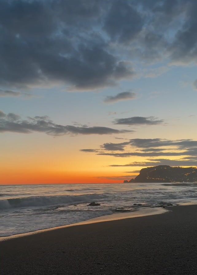 beach at sunset. The sky is a mix of dark blue, gray, and orange. There are clouds scattered across the sky. The ocean is visible, with small waves rolling in towards the shore. The beach is made of dark sand and small pebbles. In the distance, there is a land mass with lights on it. The scene is still and quiet.