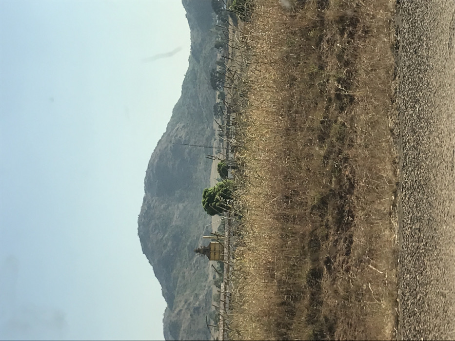 A landscape shows a hazy mountain rising in the background. The foreground is filled with dry, golden grass and sparse vegetation. A fence line runs parallel to the road that is to the side, and small trees dot the landscape. The sky is a pale blue.