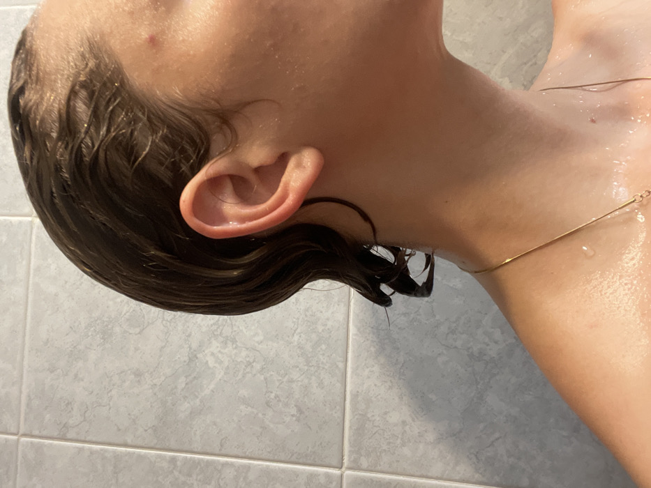 The image displays the right profile of a person from the upper shoulder to the side of the head. The individual's dark, wet, wavy hair is styled away from the face, with visible water droplets clinging to the strands and skin. A small, reddish blemish is present on the upper right forehead near the hairline. The right ear is fully visible and appears wet. A thin, gold-colored chain necklace is worn around the neck, which, along with the visible shoulder, is also covered in small water droplets. The background consists of light gray square tiles with visible grout lines, indicative of an indoor bathroom or shower setting. This scene is located in Mexico City, Mexico.