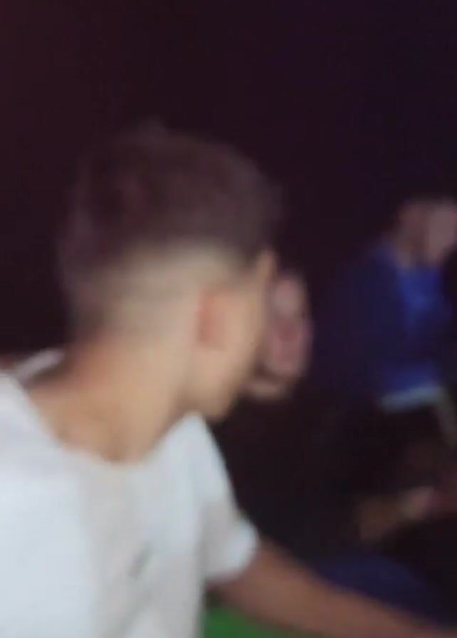 blurry close-up of a young man with dark hair and a slight mustache. He is wearing a white t-shirt. He is holding a lit cigarette in his hand and talking. There is another person in the background, but they are out of focus. The background is dark.